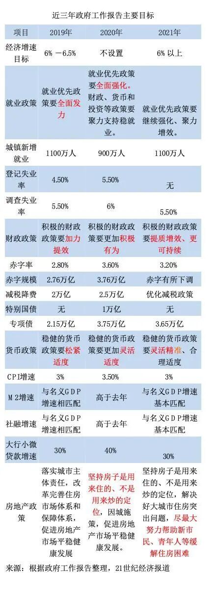 根据提请大会审议的政府工作报告,国内生产总值增长6%以上、赤字率拟按3.2%左右安排、拟安排地方政府专项债券规模3.65万亿元、不再发行抗疫特别国债……时隔一年,经济增速目标重现政府工作报告,调控政策“不急转弯”内涵丰富,预算赤字率、新增地方政府专项债券规模等均有不同程度下降,今年不再发行抗疫特别国债,处处彰显经济运行与宏观政策有序回归常态的信号,社会关注的一些应急政策的到期退出和接续问题也得到明确,“不急转弯”给出定心丸!报告还透露了哪些政策信号?先附上极简版本,帮助大家三分钟了解重要信息。 政 府 工 作 报 告 极 简 版 !只 有 6 0 0 字 年初剩余的551万农村贫困人口全部脱贫、52个贫困县全部摘帽减税:将小规模纳税人增值税起征点从月销售额10万元提高到15万元创新:以“十年磨一剑”精神在关键核心领域实现重大突破乡村振兴:做好巩固拓展脱贫攻坚成果同乡村振兴有效衔接开放:推动区域全面经济伙伴关系协定尽早生效实施、中欧投资协定签署医保:居民医保和基本公共卫生服务经费人均财政补助标准分别再增加30元和5元住房:解决好大城市住房突出问题。规范发展长租房市场,降低租赁住房税费负担港澳台:完善特别行政区同宪法和基本法实施相关的制度和机制一年一度的政府工作报告是当年经济发展和政策走向的重要风向标,一直备受市场关注。梳理来看,今年政府工作报告主要透露了10大政策信号。经济增速目标是各界最为关注的内容。因为疫情带来巨大的不确定性,去年并没有设定GDP增速目标。而现在国内疫情已控制住、疫苗接种率不断提高,市场也在关注:今年会不会恢复设定GDP增速目标;如果恢复,增速目标会设置多少?报告今年恢复设置GDP增速目标,设定的目标值是6%以上。报告解释称,经济增速是综合性指标,今年预期目标设定为6%以上,考虑了经济运行恢复情况,有利于引导各方面集中精力推进改革创新、推动高质量发展。经济增速、就业、物价等预期目标,体现了保持经济运行在合理区间的要求,与今后目标平稳衔接,有利于实现可持续健康发展。分析来看,今年恢复设定GDP增长目标传达出正常化的信号。但由于去年低基数扰动,今年实际GDP增速较高(市场预计8%左右),设定GDP增速目标更多是象征性含义,并为其他目标提供参考锚。6%是对于历史目标的合理衔接。此前2019年的GDP目标设定为6%-6.5%,今年将目标数字设定6%是较好衔接。此外,如果设置过高的预期目标并不反映经济潜在产出增速,缺乏实际意义。中国社科院测算,“十四五”期间中国经济潜在增长率在5%-6%区间。2019年首次将就业优先政策置于宏观政策层面。去年政府工作报告称,就业优先政策要全面强化。财政、货币和投资等政策要聚力支持稳就业,表述相比上一年有所强化。今年政府工作报告表示,就业优先政策继续强化、聚力增效。我国政府就业目标包含三个指标:城镇新增就业人口、城镇登记失业率和城镇调查失业率。其中,我国城镇调查失业率自2018年起开始公布、并首次纳入政府预期目标。去年政府工作报告将全年就业目标放宽(新增就业900万以上/调查失业率6%左右/登记失业率5.5%左右)。但去年国内经济恢复好于预期,实现城镇新增就业1186万人,达到正常年份的目标;调查失业率年底降至5.2%,持平于2019年同期。今年经济形势改善,新增就业、调查失业率目标也恢复至疫情前的水平,登记失业率并不能准确地反映失业情况,今年已不列入政府工作报告。2020年疫情导致宏观环境剧变、两会召开推迟,政府报告对宏观政策定调也因势而变。今年回归常态化,政府工作报告的定调也延续经济工作会议的定调。报告指出,保持宏观政策连续性稳定性可持续性,促进经济运行在合理区间。在区间调控基础上加强定向调控、相机调控、精准调控。宏观政策要继续为市场主体纾困,保持必要支持力度,不急转弯,根据形势变化适时调整完善,进一步巩固经济基本盘。去年货币政策已暂停降息、边际收紧,2021年调子会顺着这个走,定调不再是宽松。当然,不急转弯意味着也不会骤然收紧。去年财政政策扩张导致政府杠杆率大幅攀升,加大了财政风险、透支未来财政空间 。今年财政政策将回归常态化,“不急转弯”意味着今年财政退坡幅度不会太大,仍会保持对经济恢复的必要支持力度。报告指出,积极的财政政策要提质增效、更可持续。因财政收入恢复性增长,财政支出总规模比去年增加,重点仍是加大对保就业保民生保市场主体的支持力度。从当前的经济恢复情况来看,财政逆周期需求已逐渐减弱,今年不再延续去年的应急策略,但积极取向依然保持不变。财政政策一般偏中期性,政策退出所需要的时间比较长,不会贸然转向。今年财政政策更可持续体现为赤字率回调、专项债额度小幅减少、不再增发抗疫特别国债。其中,不再增发抗疫特别国债也传递出国内经济回归正常化的信号。2019年赤字率是2.8%,离3%的警戒线还有0.2个百分点。2020年赤字率按照3.6%以上安排,这是赤字率首度超过3%。今年赤字率调降为3.2%, 仍处于3%的上方。一来为应对不确定性留有余地,二来也体现政策的连续性、不急转弯。赤字率的回落,意味着今年赤字规模将下降(去年3.76万亿)。专项债于2015年首度发行,当年发行1000亿。2016年、2017年,其发行量分别扩张到4000亿、8000亿,2018年